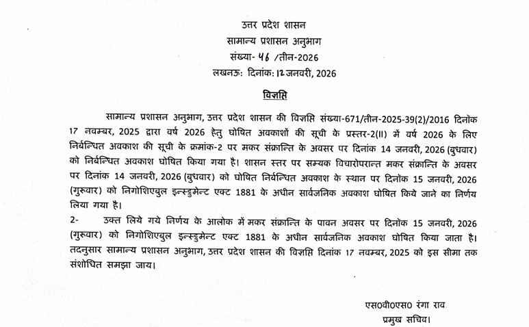 राज्य सरकार के प्रवक्ता ने साेमवार काे बताया कि राज्य में अवकाश की सूची 17 नवंबर 2025 को जारी हुई थी। इस सूची में 14 जनवरी को मक संक्रांति का निबंधित अवकाश घाेषित था। शासन स्तर पर सम्यक विचार के बाद तय किया कि मकर संक्रांति के अवसर पर अवकाश होना चाहिए। इसलिए अब 14 जनवरी के स्थान पर 15 जनवरी (गुरुवार) को सार्वजनिक अवकाश रहेगा। इस दिन सभी सरकारी कार्यालय व स्कूल बंद रहेंगे। इस संबंध में शासन की ओर से साेमवार काे आदेश पत्र जारी कर दिया गया है।