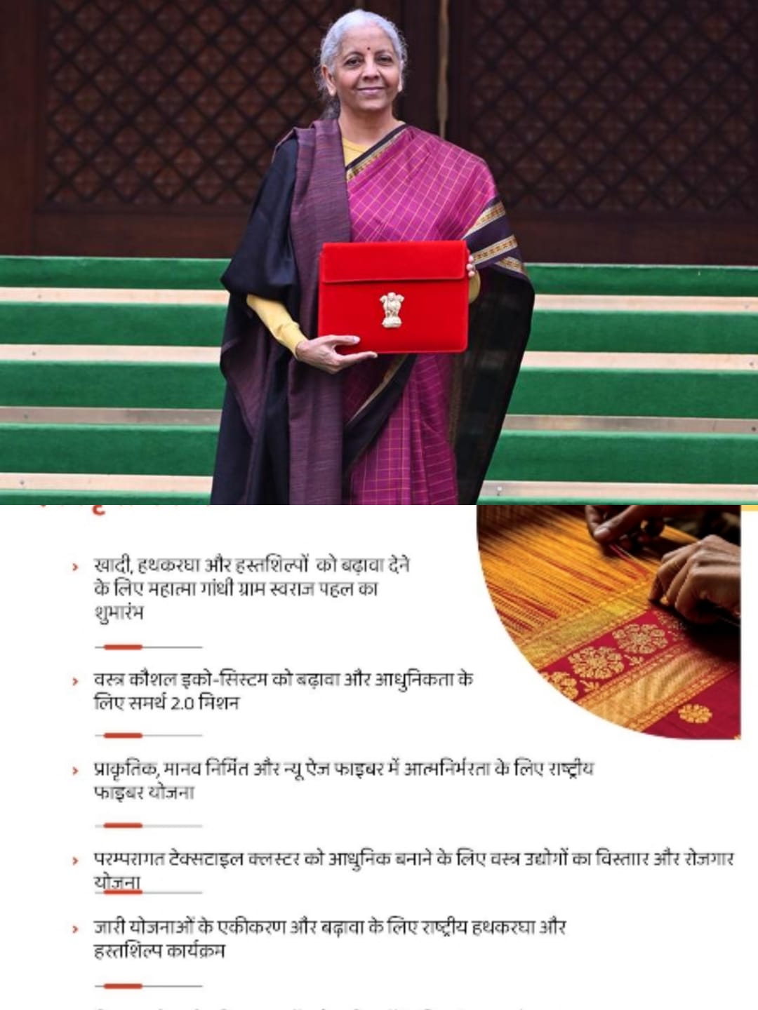 वित्त मंत्री ने वस्त्र उद्योग को आधुनिक और वैश्विक स्तर पर प्रतिस्पर्धी बनाने के लिए सात प्रमुख एकीकृत कार्यक्रम की घोषणाएं कीं। इनमें खादी, हथकरघा और हस्तशिल्पों को बढ़ावा देने के लिए महात्मा गांधी ग्राम स्वराज पहल का शुभारंभ, वस्त्र कौशल इको-सिस्टम को बढ़ावा और आधुनिकता के लिए समर्थ 2.0 मिशन, प्राकृतिक, मानव निर्मित और न्यू ऐज फाइबर में आत्मनिर्भरता के लिए राष्ट्रीय फाइबर योजना हैं। इसके अलावा परम्परागत टेक्सटाइल क्लस्टर को आधुनिक बनाने के लिए वस्त्र उद्योगों का विस्तार और रोजगार योजना, जारी योजनाओं के एकीकरण और बढ़ावा के लिए राष्ट्रीय हथकरघा और हस्तशिल्प कार्यक्रम, विश्व स्तरीय और टिकाउ वस्त्रों और परिधानों के लिए टेक्स-इको पहल और चुनौती के स्तर पर मेगा टेक्स्टाइल पार्कों की स्थापना करने की घोषणा भी शामिल है।