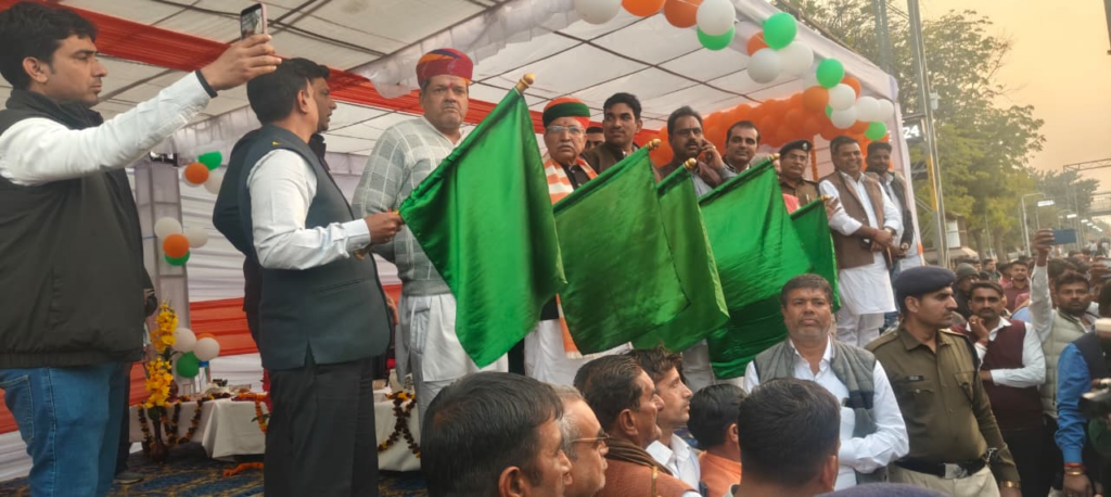 केंद्रीय कानून मंत्री अर्जुन राम मेघवाल तथा खाद्य एवं नागरिक आपूर्ति मंत्री सुमित गोदारा ने हरी झंडी दिखाकर ट्रेन का शुभारम्भ किया।